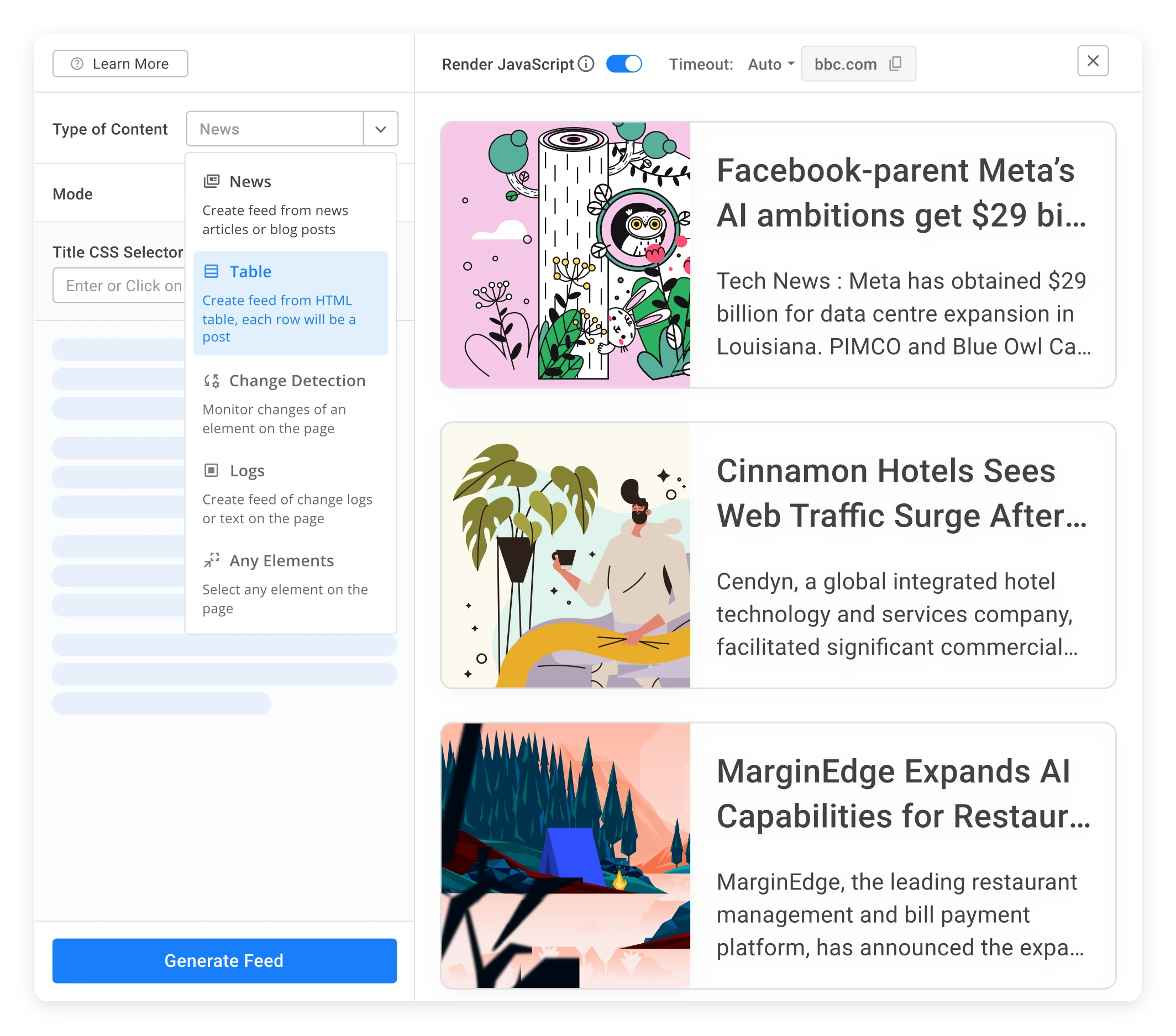 Generate a feed from HTML tables in just a few clicks. No tech background needed—just pick your table and go.
