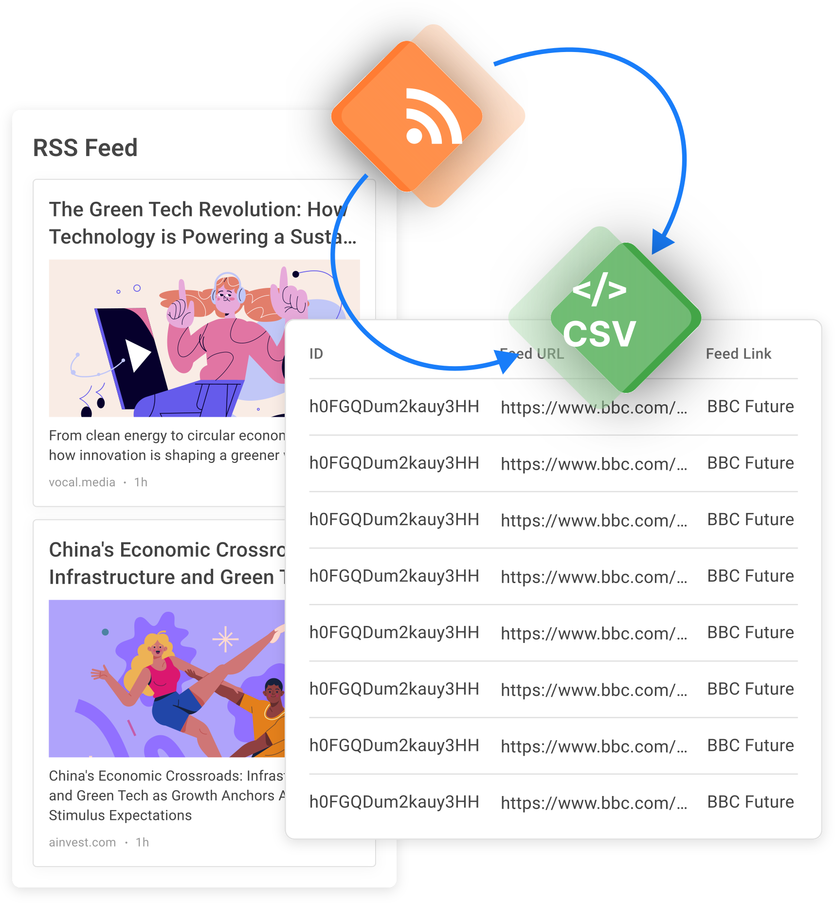 Fügen Sie einen RSS-Link ein und laden Sie sofort eine strukturierte CSV-Datei herunter. Keine Einrichtung erforderlich.